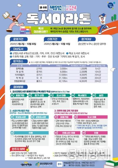 동네방네 김형규 기자 | 금산군은 일상 속 군민들의 독서 습관 형성을 돕고 책 읽는 공동체 문화를 확산하기 위해 2월 2일부터 10월 30일까지 제4회 독서마라톤을 개최한다.