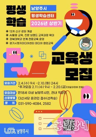동네방네 김형규 기자 | 남양주시는 오는 2월 4일부터 10일까지 2026년 상반기 평생학습센터 교육생 1,335명을 모집한다고 30일 밝혔다.