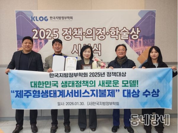 동네방네 김형규 기자 | 제주특별자치도의 ‘제주형 생태계서비스지불제’가 한국지방정부학회 주관 ‘2025년 정책대상’에서 최고상인 대상을 받는다. 시상식은 30일 부산 동아대학교에서 열린다.