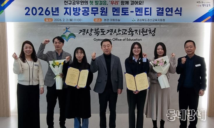 동네방네 김형규 기자 | 경산교육지원청 정수권 교육장은 2일 오전 11시부터 교육지원청 5층 대회의실에서 신규 공무원 2명과 선배공무원들이 참석한 가운데 지방공무원 후견인제(멘토-멘티) 결연식을 개최했다.