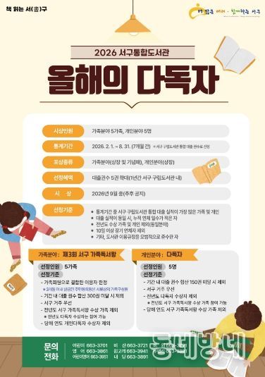 동네방네 김형규 기자 | 대구 서구청은 구민들의 독서 문화 확산과 도서관 이용 활성화를 위해 개인 및 가족 분야에서 다독자를 선발한다고 밝혔다.