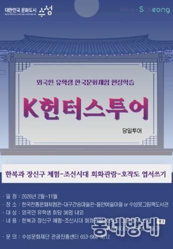 동네방네 김형규 기자 | 대구 수성문화재단은 올해 2월부터 11월까지 대구·경북 외국인 유학생을 대상으로 한국문화체험 현장학습 ‘K헌터스 투어’를 운영한다.
