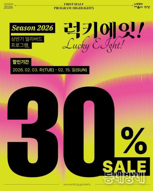 동네방네 김형규 기자 | 안동문화예술의전당은 상반기 주요 공연을 대상으로 30% 할인 혜택을 제공하는 특별 프로모션 ‘럭키에잇!’을 진행한다고 밝혔다.