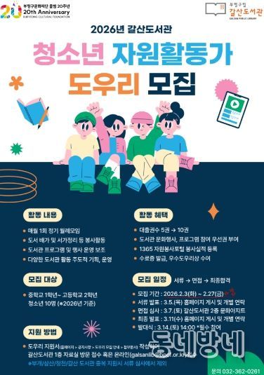동네방네 김형규 기자 | 부평구립 갈산도서관은 오는 27일까지 청소년 자원활동가 ‘도우리’를 모집한다고 밝혔다.