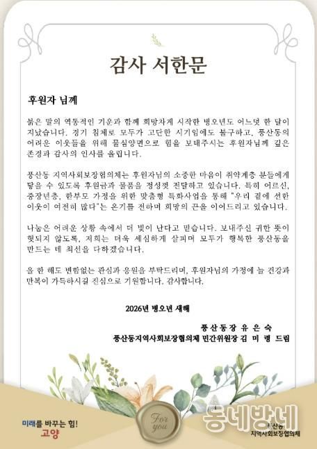동네방네 김형규 기자 | 고양특례시 일산동구 풍산동 지역사회보장협의체는 설명절을 앞둔 지난 3일 지난해 지역사회의 어려운 이웃을 위해 따뜻한 나눔을 실천한 후원자들에게 감사의 마음을 담은 서한문을 발송했다.