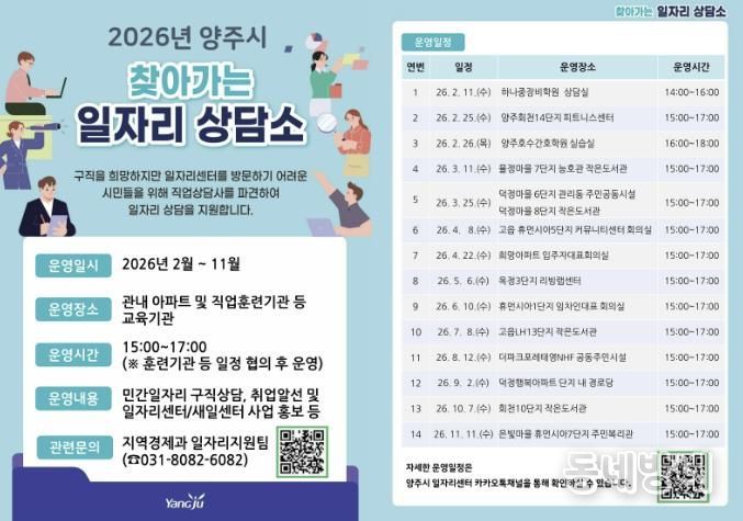 동네방네 김형규 기자 | 양주시가 구직 현장의 문턱을 낮추고 시민들의 취업 성공률을 높이기 위해 오는 11월까지 ‘2026년 찾아가는 일자리 상담소' 를 운영한다.