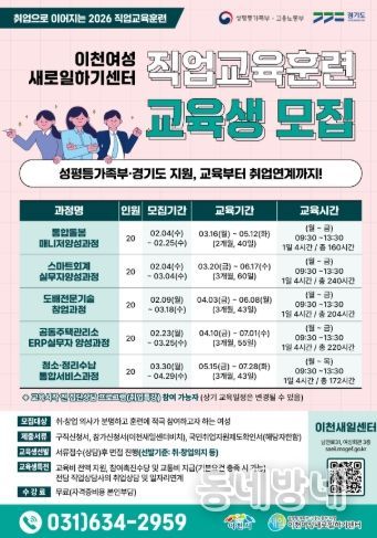 동네방네 김형규 기자 | 이천여성새로일하기센터는 경력 단절 여성의 직업능력 개발과 취·창업 연계를 위해 2026년 직업교육훈련 교육생을 모집한다.