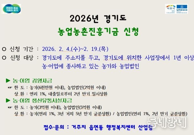 동네방네 김형규 기자 | 이천시는 농업인에게 장기·저리 융자 지원을 실시하고 경영안정을 돕기 위해 2026년 경기도 농업농촌진흥기금 농어업 경영자금, 농어업 생산유통시설자금 사업에 대한 신청을 2월 3일부터 접수한다.