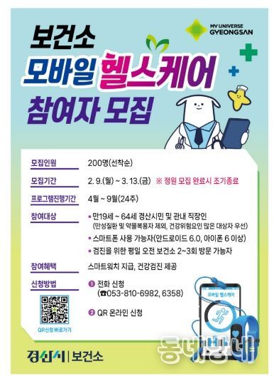 동네방네 김형규 기자 | 경산시는 ICT 기술을 활용해 시민의 생활 습관을 개선하는‘2026년 모바일 헬스케어 사업’ 참여자 200명을 오는 9일부터 모집한다고 밝혔다.