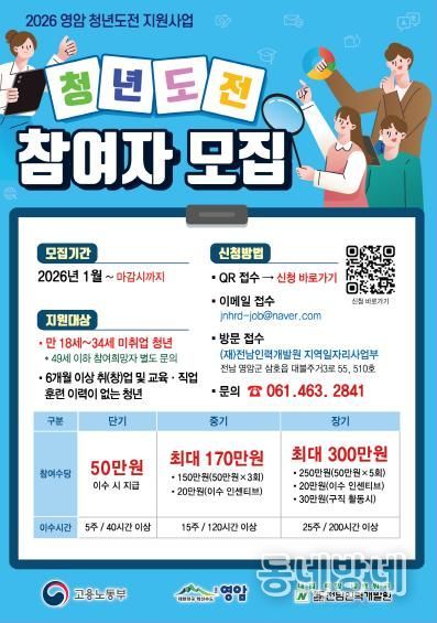 동네방네 김형규 기자 | 영암군이 (재)전남인력개발원과 ‘2026년 영암군 청년 도전 지원사업’ 참여자를 모집 중이다.