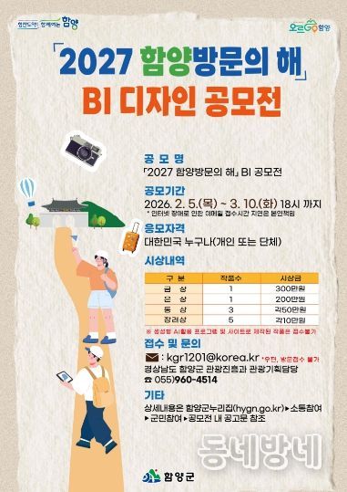 공모 주제는 '2027 함양 방문의 해'를 상징하는 브랜드 이미지(BI) 디자인이며, 대한민국 국민이라면 누구나 개인 또는 단체 자격으로 참여할 수 있다. 접수 기간은 2월 5일부터 3월 10일까지다.