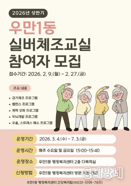 동네방네 김형규 기자 | 수원시 팔달구 우만1동은 관내 어르신들의 건강 증진을 위해 2월 9일부터 2월 27일까지 ‘2026년 상반기 실버체조교실’ 참여자를 선착순으로 모집한다고 밝혔다.