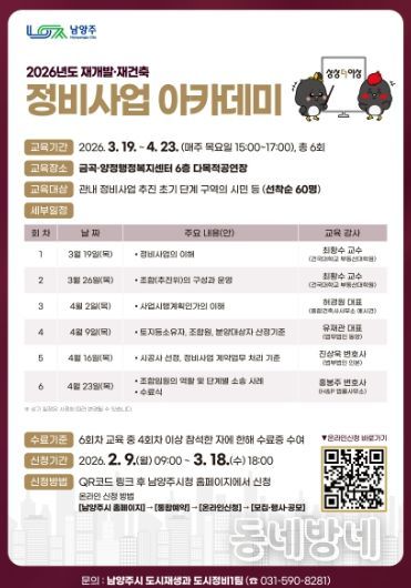 동네방네 김형규 기자 | 남양주시는 오는 3월 19일부터 정비사업에 관심 있는 시민을 대상으로 ‘2026 상상더이상 정비사업 아카데미’를 열고, 이에 앞서 2월 9일부터 참가 신청 접수를 진행한다고 6일 밝혔다.