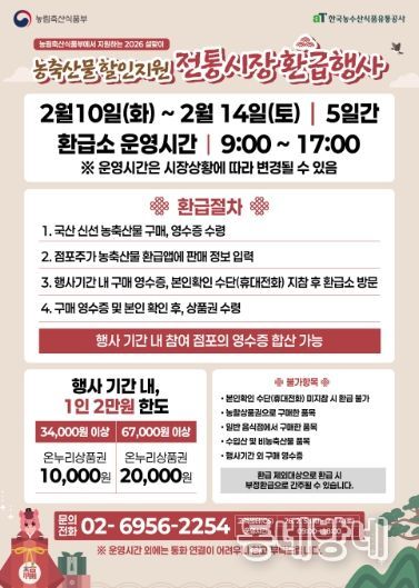 백은정 경제정책과장은 “설 명절을 맞아 전통시장을 찾는 소비자들의 장바구니 물가 부담을 덜어주는 계기가 되길 바란다”며 “이번 행사가 전통시장 이용 확대와 지역 경제 활성화로 이어지길 기대한다”고 말했다.