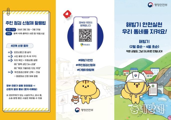 동네방네 김형규 기자 | 이천시가 기온 상승으로 사고발생 위험이 높아지는 해빙기를 맞아, 시민들이 직접 생활 속 위험 요인을 찾아 점검을 요청하는 ‘해빙기 안전점검 주민점검신청제’를 시행한다고 밝혔다.