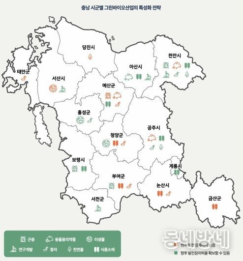 특히 “▲곤충은 천안·예산·부여, ▲동물용의약품은 천안·예산·공주, ▲미생물은 서산·홍성·청양, ▲식품소재는 논산·금산·부여·청양, ▲연구개발은 천안·서천, ▲종자는 예산·부여·청양·논산, ▲천연물은 당진·예산 등에서 권역별 특성화 전략을 펼쳐야 할 것”이라고 말했다.