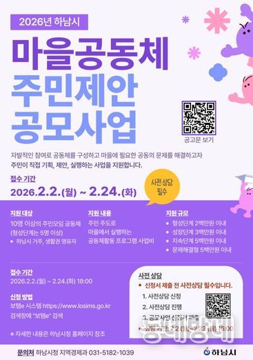 동네방네 김형규 기자 | 하남시는 오는 2월 24일까지 ‘2026년 하남시 마을공동체 주민제안 공모사업’에 참여할 주민모임 공동체를 모집한다.