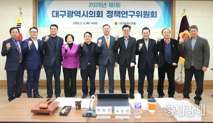 동네방네 김형규 기자 | 대구광역시의회는 2월 5일 오후 2시, 시의회 3층 회의실에서 ‘2026년 제1회 대구광역시의회 정책연구위원회’를 개최해, 2025년에 완료된 의원 정책연구의 추진 과정과 내용에 대한 적절성 등을 중점 점검하고, 2026년 상반기의 연구과제로 ‘대구·경북 의회통합 방안 연구’를 심의·의결했다.