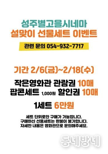 동네방네 김형규 기자 | 성주별고을시네마(창의문화센터 3층)는 민족 대명절 설을 맞아 2월 6일부터 2월 18일까지 ‘설맞이 선물세트 이벤트’를 진행한다.