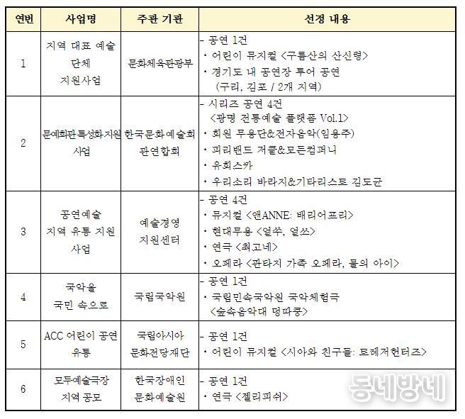 이번에 선정된 사업은 ▲지역 대표예술단체 지원 사업(문화체육관광부) ▲문예회관 특성화 지원 사업(한국문화예술회관연합회) ▲공연예술 지역 유통 지원 사업(예술경영지원센터) ▲지역 문화향유기회 확대를 위한 '국악을 국민 속으로'(국립국악원) ▲ACC 어린이 공연 유통(국립아시아문화전당재단) ▲모두예술극장 지역 공연 공모(한국장애인문화예술원)이다.