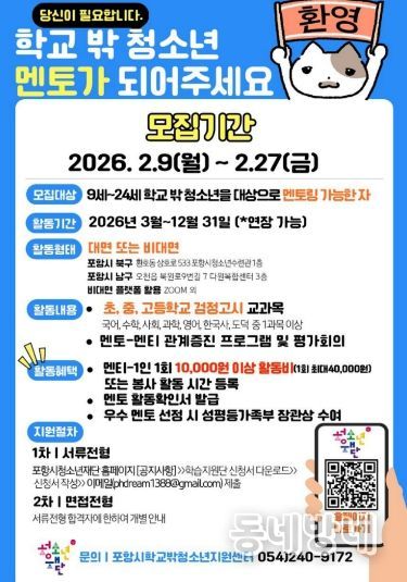 동네방네 김형규 기자 | 포항시청소년재단 학교밖청소년지원센터는 학교 밖 청소년의 학습권 보장과 학업 지속을 돕기 위해 ‘학습지원단’ 멘토를 모집한다.