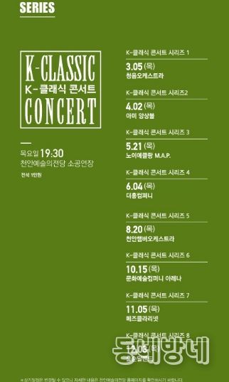 K-클래식 콘서트는 총 8회로, 소공연장에서 관객과 가까이 호흡하는 무대로 운영된다. 내달 ‘청음오케스트라’를 시작으로 △4월, 아미 앙상블 △5월, 노이에클랑 M.A.P △6월, 더흥컴퍼니 △8월, 천안챔버오케스트라 △10월, 문화예술컴퍼니 아레나 △11월, 메즈클라리넷 △12월 홍순달 밴드까지 장르와 구성의 폭을 넓힌 다채로운 무대가 이어질 예정이다.