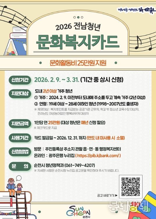 동네방네 김형규 기자 | 순천시는 청년들의 문화생활 향유 및 자기계발 활동을 지원하기 위해 2026년 전남청년 문화복지카드 지원사업 대상자를 오는 3월 31일까지 모집한다.