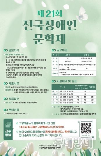 동네방네 김형규 기자 | 고양시장애인종합복지관은 3월 19일까지 전국의 장애인 및 장애인 가족을 대상으로 ‘제21회 전국장애인문학제’ 작품 접수를 진행한다.