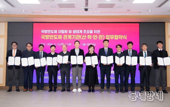 동네방네 김형규 기자 | 경상북도는 2월 12일 구미시청에서 양금희 경제부지사, 김장호 구미시장이 참석한 가운데 한국과학기술연구원(KIST), 서울대학교 반도체공동연구소를 비롯한 노융합기술원(NINT), 대구경북과학기술연구원(DGIST), 구미전자정보기술원, 국립금오공과대학교, 경운대학교 등 국방·반도체 분야 주요 연구기관・대학, ㈜KEC, 한화시스템, LIG넥스원 등 산업계 대표 기업이 참여한 ‘국방반도체 자립화 및 생태계 조성을 위한 업무협약(MOU)’을 체결했다고 밝혔다.