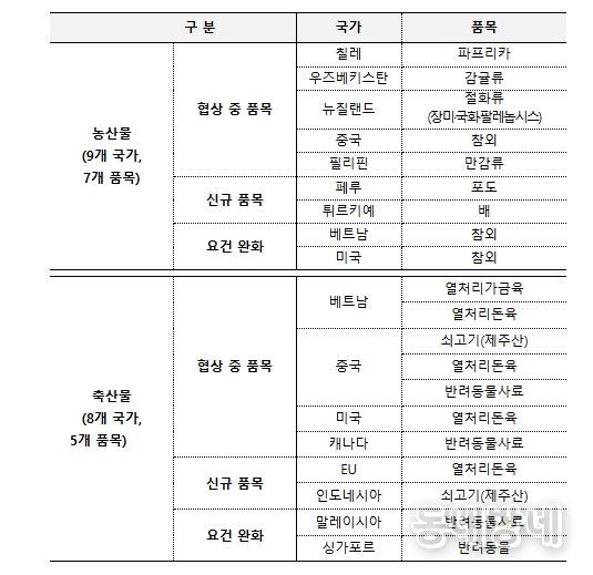 ① 딸기(브라질), 단감(중국), 포도(필리핀), 쇠고기·돼지고기(싱가포르), 반려동물사료(베트남·인도네시아), 필리핀(열처리돈육가공품) 등