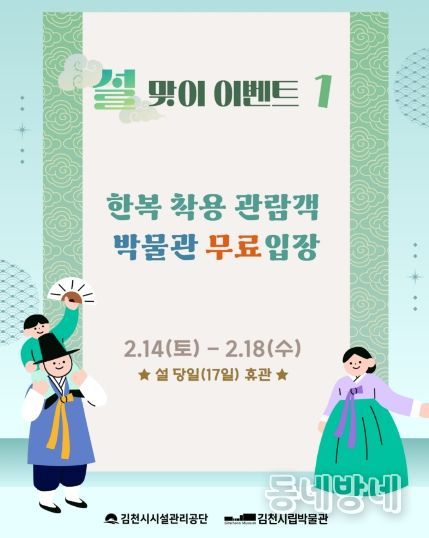 동네방네 김형규 기자 | 김천시시설관리공단(이사장 김재광)은 2026년 설 명절을 맞아 감문국이야기나라와 김천시립박물관을 중심으로 가족 단위 관람객이 함께 즐길 수 있는 ‘설맞이 문화 행사’를 운영한다. 이번 행사는 2월 14일부터 2월 18일까지 진행된다.