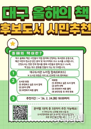 권현주 대구도서관장은 “대구 올해의 책은 시민이 직접 참여해 함께 만들어가는 대표적인 독서문화 사업”이라며 “어린이부터 성인까지 다양한 세대의 생각이 담긴 추천이 모여 올해의 책이 선정되는 만큼, 많은 시민께서 관심을 두고 소중한 한 권을 추천해 주시길 바란다”고 말했다.