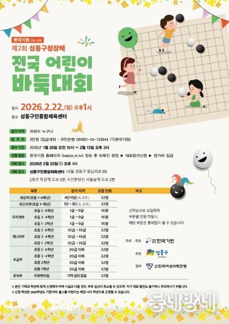 동네방네 김형규 기자 | 서울 성동구는 오는 2월 22일 오후 1시 성동구민종합체육센터 대체육관 1층에서 ‘제2회 성동구청장배 전국 어린이 바둑대회’를 개최한다고 밝혔다.