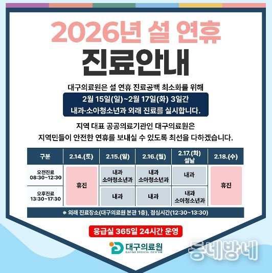 동네방네 김형규 기자 | 대구의료원이 설 연휴 기간(2.14.~18.) 응급실 운영을 강화하고, 2월 15일~17일은 내과·소아청소년과 외래 진료를 실시한다.