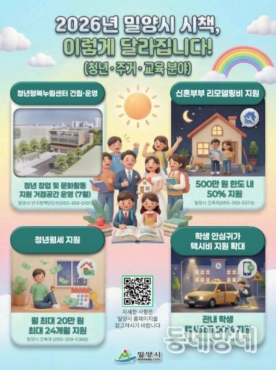 동네방네 김형규 기자 | 밀양시는 청년들이 지역에 안정적으로 뿌리 내리고 미래를 설계할 수 있도록 주거와 교육, 문화가 어우러진 ‘청년 친화 도시’ 조성에 행정력을 집중한다. 2026년 청년 정책의 핵심은 청년들의 거점 공간 마련과 안정적인 주거 사다리를 구축하는 것이다.