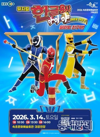 동네방네 김형규 기자 | 속초시는 3월 14일 10시 30분, 13시 30분, 16시 하루 3회 속초문화예술회관에서 뮤지컬‘한글용사 아이야 새로운 이야기-달라도 친구야’를 선보인다.