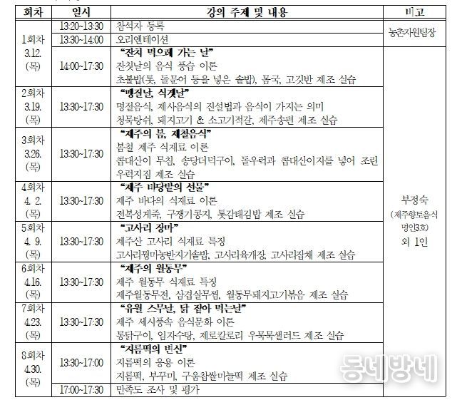 교육은 3월 12일부터 4월 30일까지 매주 1회, 총 8회에 걸쳐 진행된다. 강사는 제주향토음식명인(3호) 부정숙 제주음식문화원 원장이 맡는다. 80% 이상 출석하면 수료증을 받을 수 있다.