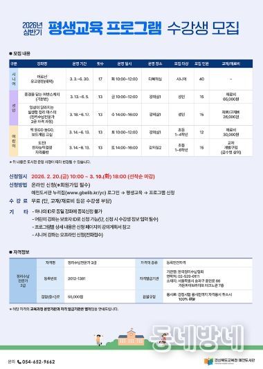 동네방네 김형규 기자 | 경상북도교육청 예천도서관(관장 김미연)은 지역 주민의 평생학습 지원을 위해 2026년 상반기 평생교육 프로그램 수강생을 모집한다.