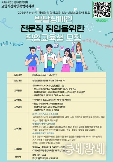 교육 신청은 3월 11일까지 복지관 1층 직업지원팀 방문 접수 또는 복지관 누리집(홈페이지)및 QR코드를 통한 온라인 접수로 가능하다.