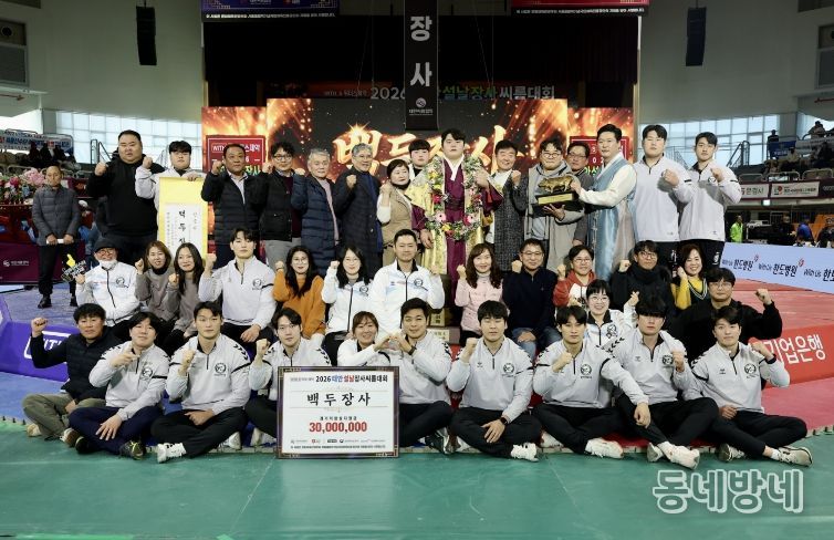동네방네 김형규 기자 | 영암군민속씨름단 김민재 장사가 18일 충남 태안종합실내체육관에서 열린 ‘2026 위더스제약 태안설날장사씨름대회’ 140kg 이하 백두급에서 우승하며 설날장사 타이틀을 거머쥐었다.
