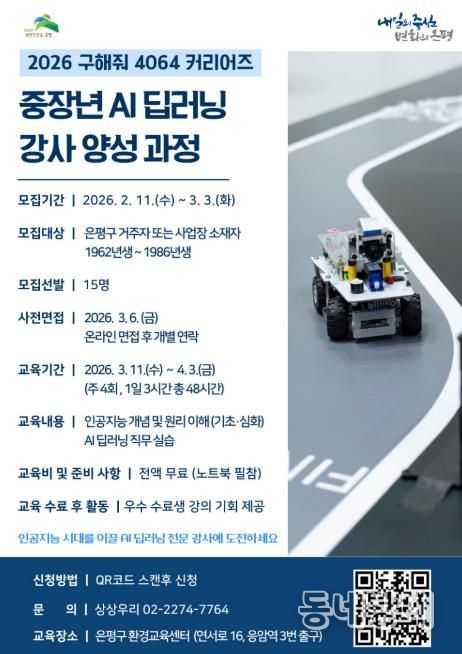 동네방네 김형규 기자 | 서울 은평구는 다음 달 3일까지 중장년층의 디지털 직무 전환과 재취업 지원을 위해 ‘AI 딥러닝 강사 양성 과정’ 참여자를 모집한다고 밝혔다.