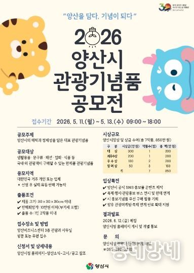 동네방네 김형규 기자 | 경남 양산시는 시 승격 30주년과 ‘2026 양산방문의 해’를 맞아 관광도시 브랜드 가치를 높이고 지역을 대표할 관광상품을 발굴하기 위해 '2026년 양산시 관광기념품 공모전'을 개최한다고 밝혔다.