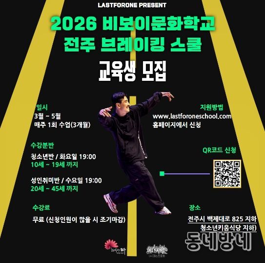 조성국 (사)라스트포원 대표는 “누구나 즐겁게 시작할 수 있도록 구성한 교육으로, 전주에서 브레이킹을 일상 속 스포츠이자 문화로 자연스럽게 배우는 계기가 되길 기대한다”고 밝혔다.