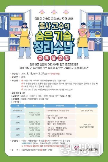동네방네 김형규 기자 | 의정부시자원봉사센터는 시민들의 주거환경 개선 역량 강화를 위해'봉사고수의 숨은 기술, 정리수납 교육'을 오는 3월 11일부터 4월 1일까지 매주 수요일 오후 2시부터 4시까지 총 4회에 걸쳐 진행하며, 이에 따른 참여자를 오는 2월 27일까지 모집한다.
