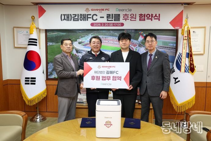 동네방네 김형규 기자 | 재단법인 김해FC가 지역 내 혁신 기업과의 파트너십을 통해 구단 경쟁력 강화와 지역 상생이라는 두 마리 토끼 잡기에 나섰다. 김해FC는 20일, 가정용 음식물처리기 전문 브랜드인 ‘린클(Reencle)’과 공식 후원 협약을 체결했다고 밝혔다. 이번 협약은 김해FC의 중장기 발전 5대 전략 중 하나인 브랜드 협력 프로젝트의 핵심 사업, ‘아이언 유니티 네트워크(Iron Unity Network)’ 구축의 일환으로 성사됐다.