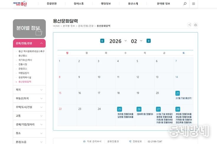 동네방네 김형규 기자 | 서울 용산구는 용산구와 용산문화원, 용산역사박물관 등 유관 기관이 운영하는 다양한 문화행사 정보를 한눈에 확인할 수 있는 온라인 기반 ‘용산문화달력’을 구축하고, 2월부터 정식 운영한다고 밝혔다.