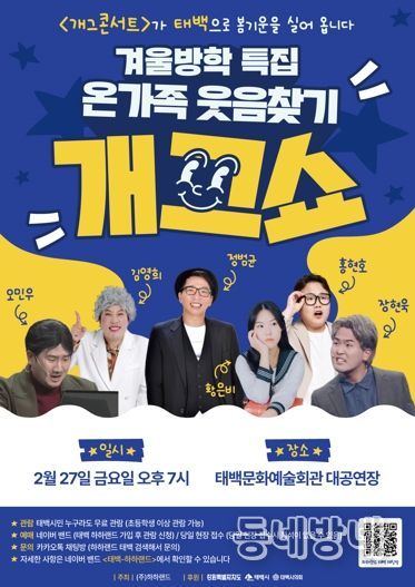 동네방네 김형규 기자 | 태백시는 겨울방학을 맞아 오는 2월 27일 오후 7시 태백문화예술회관 대공연장에서 '온가족 웃음찾기 개그쇼'를 개최한다고 밝혔다.