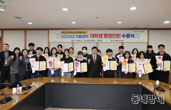 동네방네 김형규 기자 | 대구 중구는 지난 20일 구청 상황실에서 ‘2026년 겨울방학 대학생 행정인턴 수료식’을 개최했다.