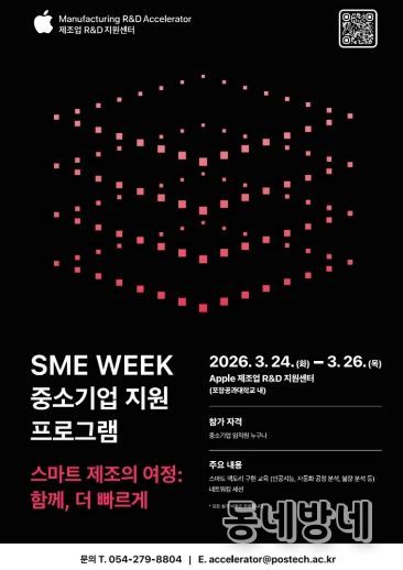 동네방네 김형규 기자 | 경상북도와 함께 제조 혁신을 추진하고 있는 애플 제조업 R·D 지원센터(포항공과대학교 내)는 오는 3월 24일부터 26일까지 3일간 중소 제조기업을 대상으로 ‘SME Week 중소기업 지원 프로그램’을 개최한다.