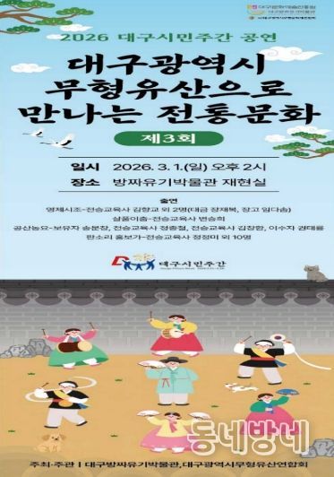 동네방네 김형규 기자 | 대구문화예술진흥원 박물관운영본부 소속 대구방짜유기박물관에서는 2026년 대구시민주간(2.21.~28.)을 맞아 3월 1일 오후 2시, 박물관 재현실에서 대구의 전통문화를 알리는 특별 공연 ‘대구광역시 무형유산으로 만나는 전통문화’를 개최한다.